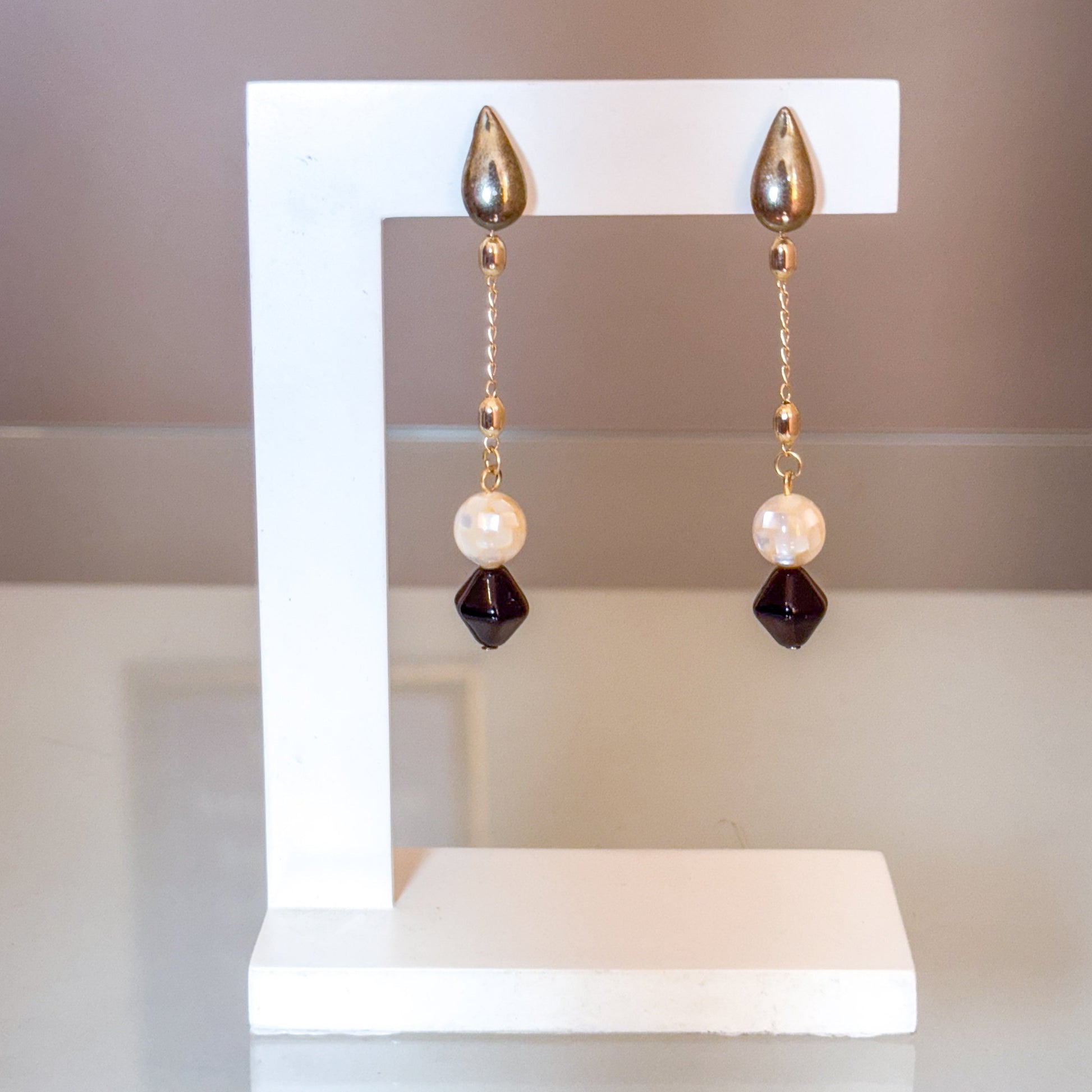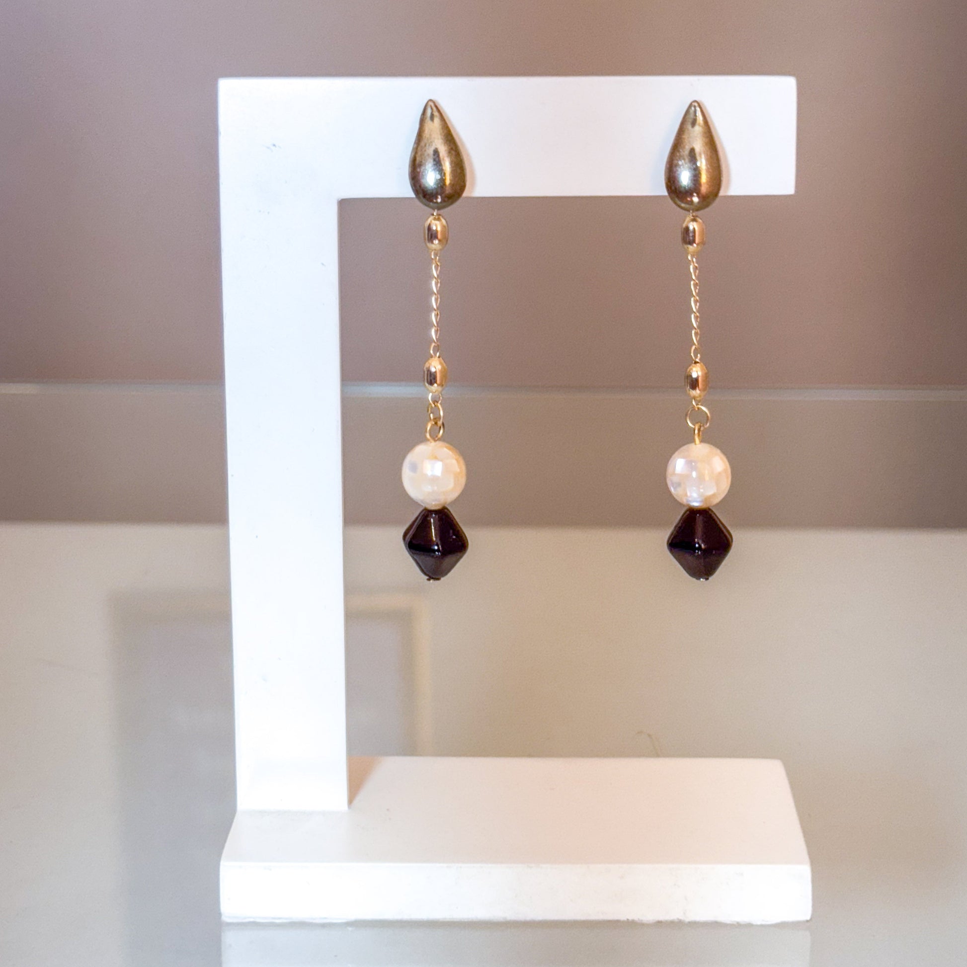Brinco feito à mão com murano preto e pérolado.