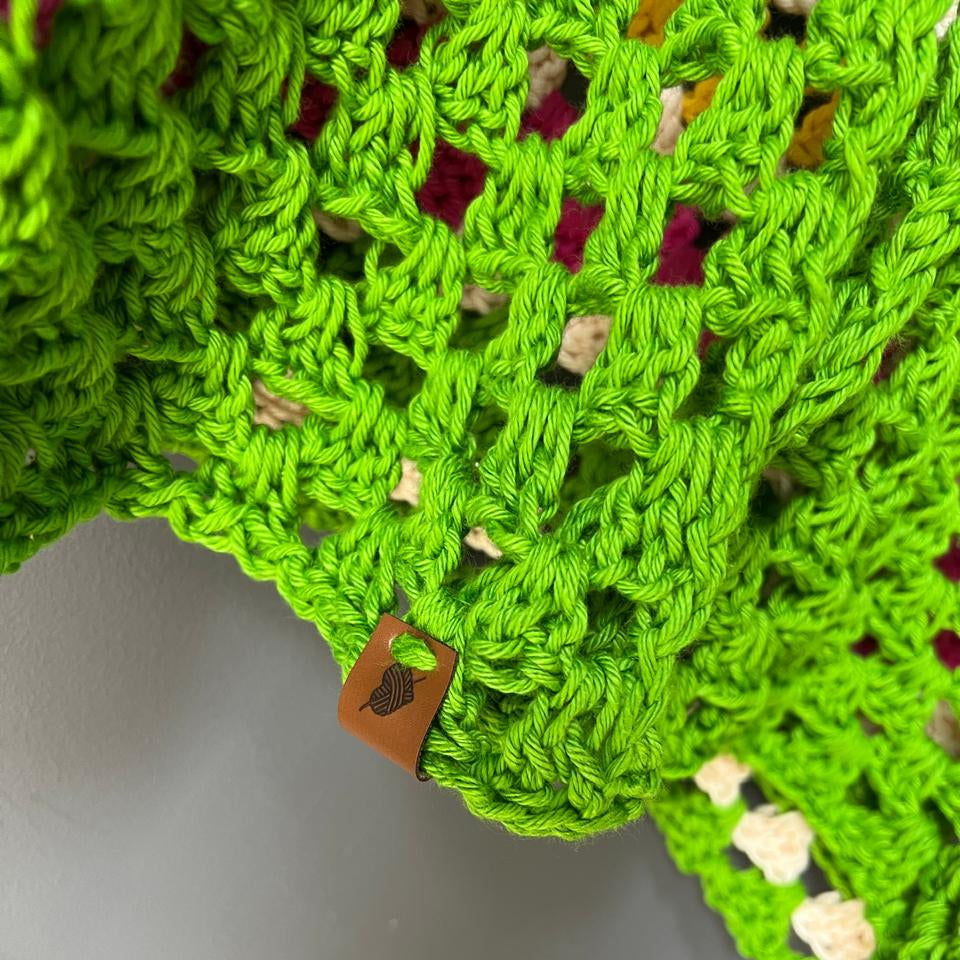 Kimono Flor Costas feito à mão em crochê com fios 100% algodão, na cor verde e nas costas flor colorida.
