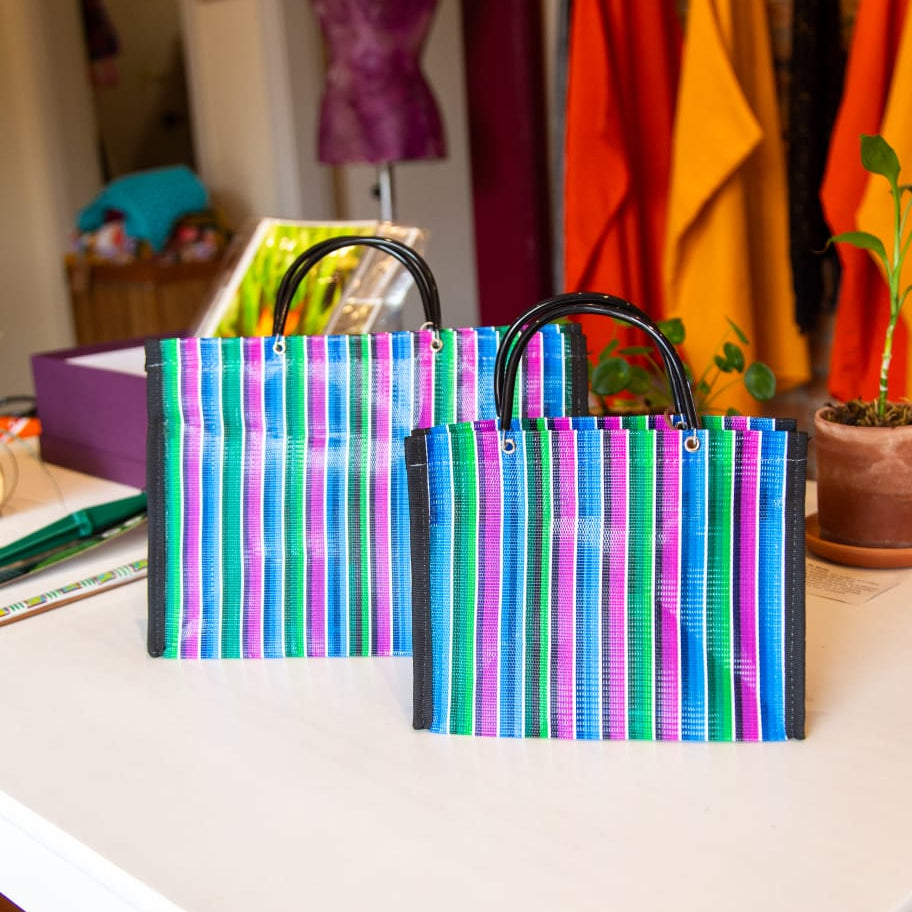 Conjunto de sacolinhas de feira nas cores azul, verde, rosa.