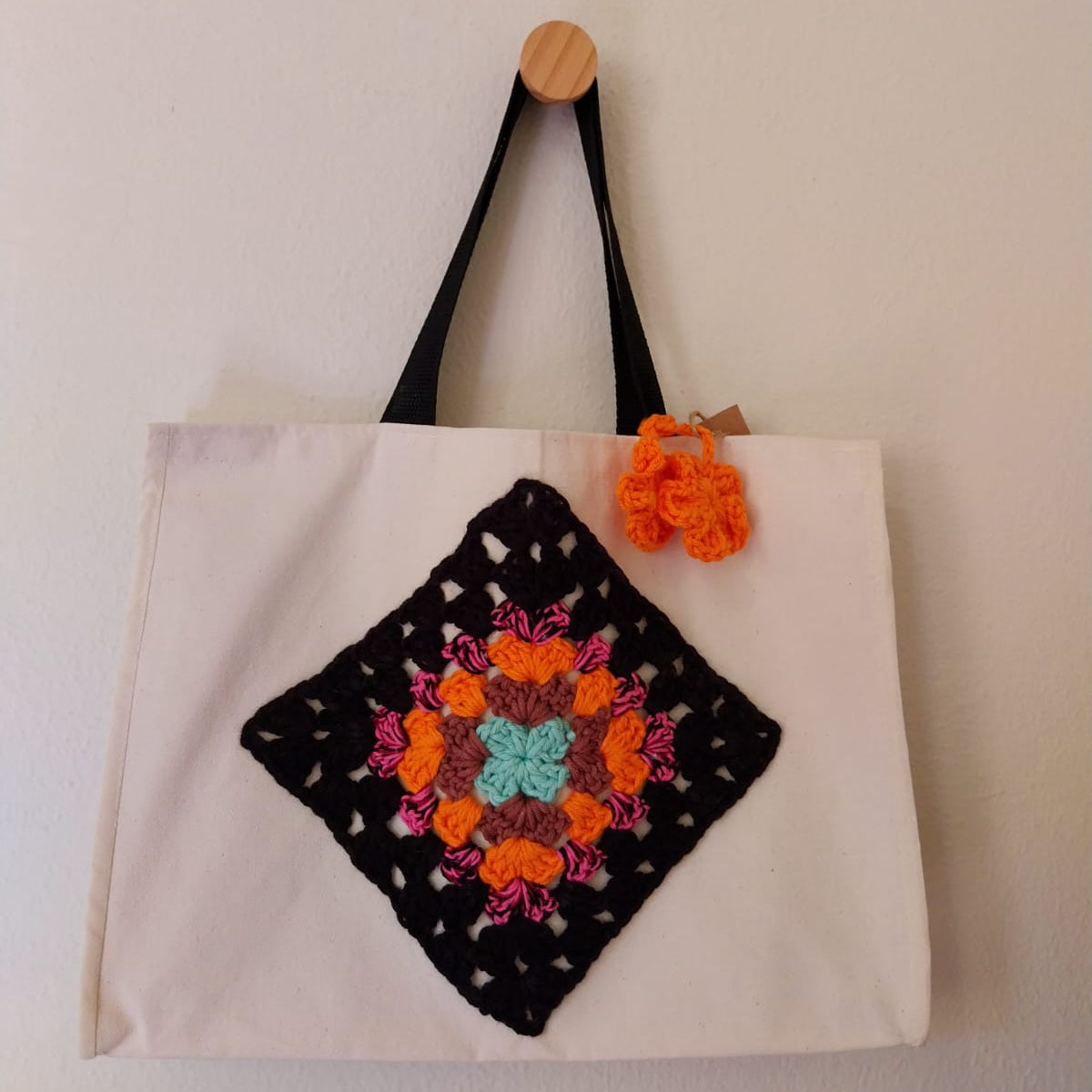 Bolsa sacola em lona de algodão, com alças e bordado feito à mão em crochê.
