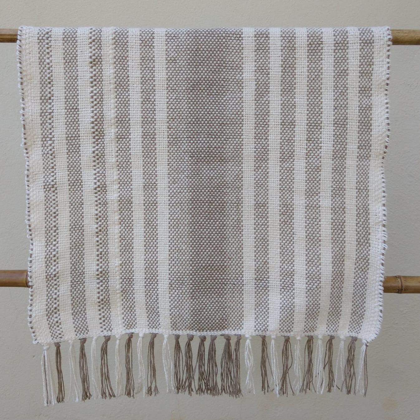 Toalha de mesa tramada manualmente com fios 100% algodão.